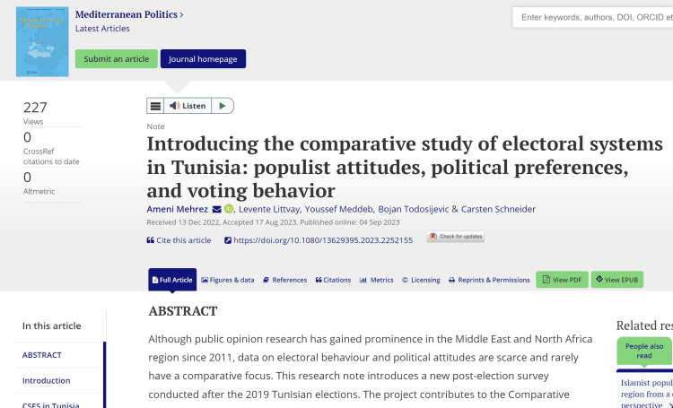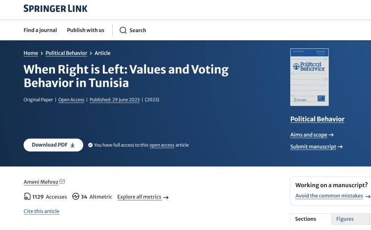 Research on electoral behavior, public opinion, political cleavages, and the role of religion in politics. Article 1 When Right is Left: Values and Voting Behavior in Tunisia Article 2 Introducing the Comparative Study of Electoral Systems in Tunisia: Populist attitudes, political preferences, and voting behavior Article 3 Like Loading...